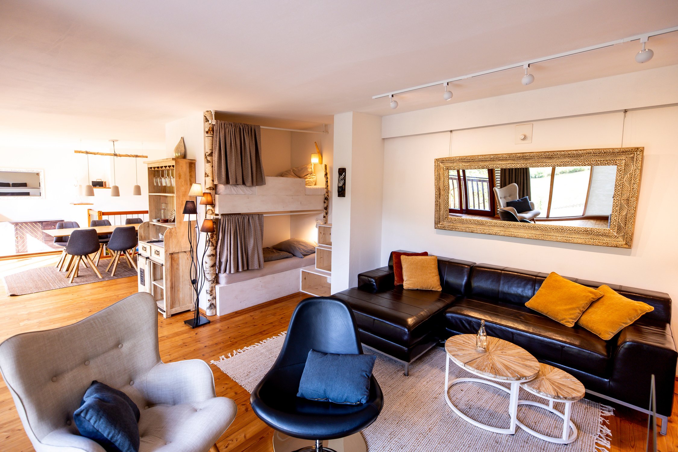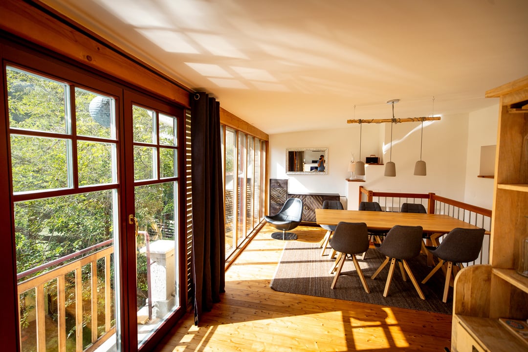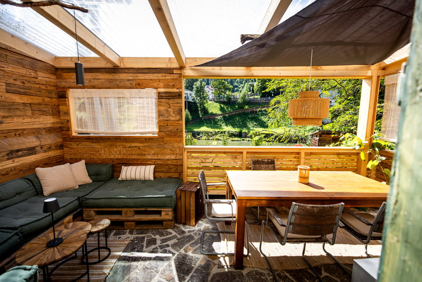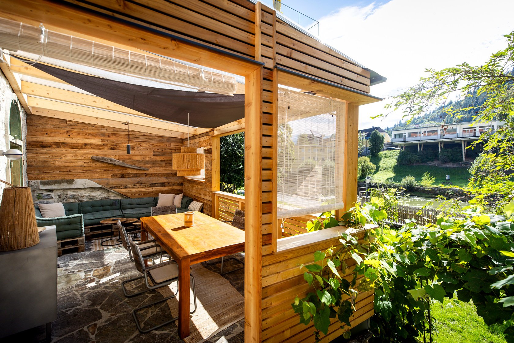 Auf 2 Etagen (ca. 90qm) bietet die Wohnung einen großzügigen Wohn, Ess- und 2 Schlafbereiche. Highlights sind die durchgehende Glasfront mit Blick auf die Mur und in den Garten, sowie die überdachte Terrasse mit Loungeecke & Esstisch.