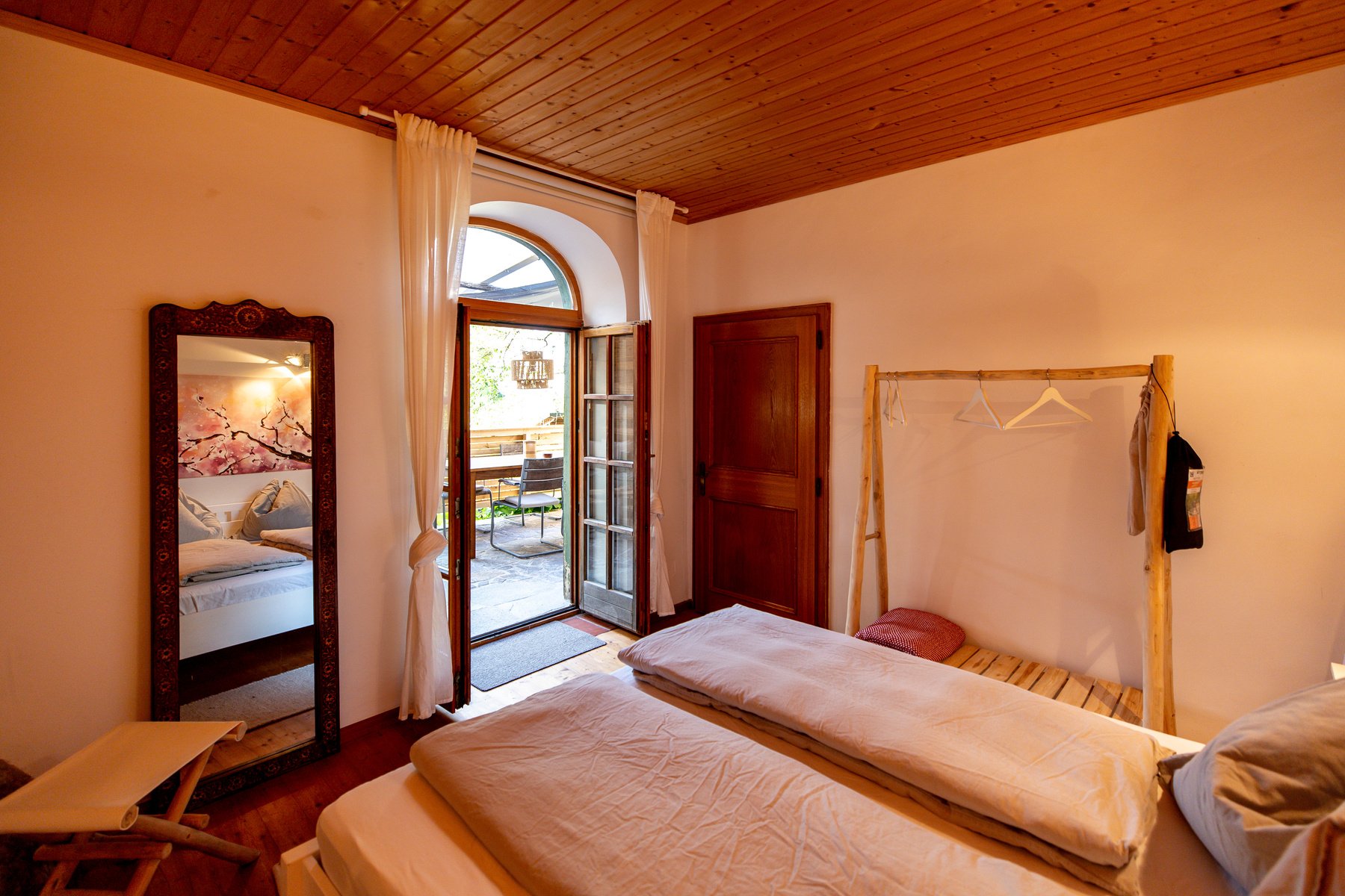 Auf der 1. Etage ist das Hauptschlafzimmer mit einem Doppelbett und mit direkten Zugang auf die Terrasse.