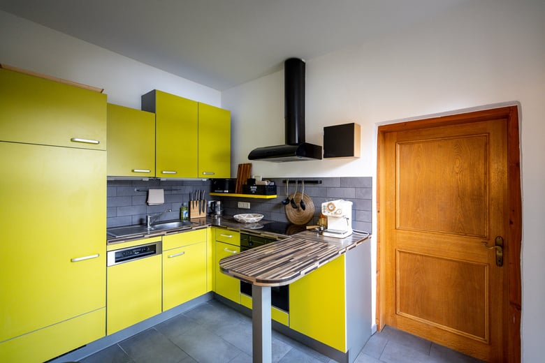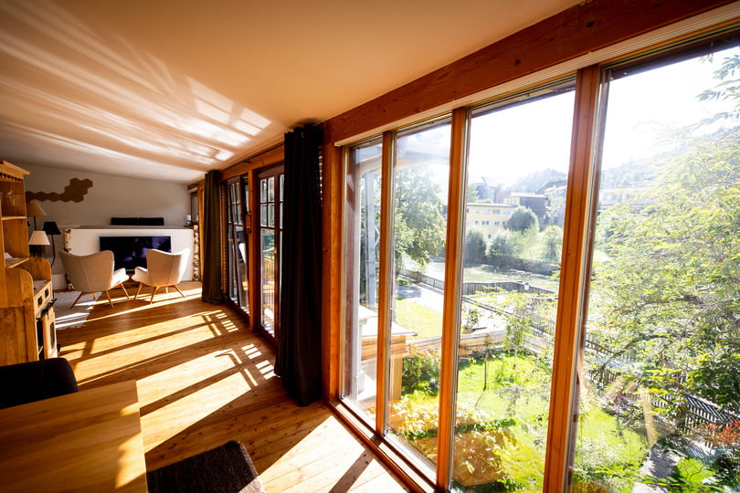 Auf 2 Etagen (ca. 90qm) bietet die Wohnung einen großzügigen Wohn, Ess- und 2 Schlafbereiche. Highlights sind die durchgehende Glasfront mit Blick auf die Mur und in den Garten, sowie die überdachte Terrasse mit Loungeecke & Esstisch.