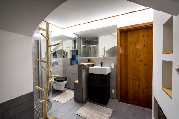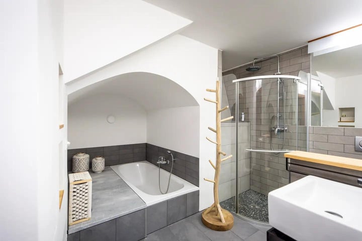 Auch das großzügige Badezimmer mit Dusche und separater Badewanne befindet sich auf dieser Ebene.